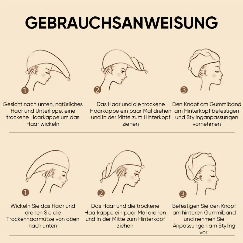 Prends le bonnet de séchage en microfibre et fais l'expérience d'un coiffage plus rapide et plus sain - commandez-le maintenant!
