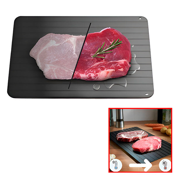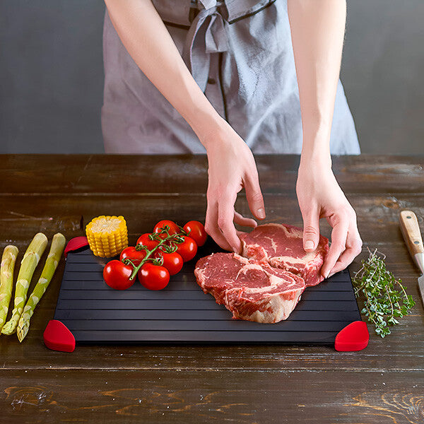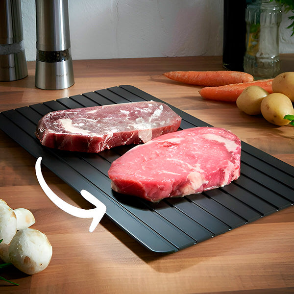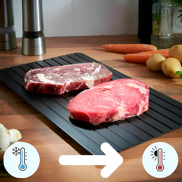 Plus besoin d'attendre des heures ! Avec la Plaque thermique pour décongélation rapide, tu peux décongeler la viande, le poisson, les légumes et autres produits surgelés jusqu'à 5 fois plus vite - tout naturellement, sans micro-ondes ni eau chaude. La surface métallique spéciale conduisant la chaleur assure un temps de décongélation régulier et sûr, afin que tes aliments restent frais, juteux et pleins de saveur!